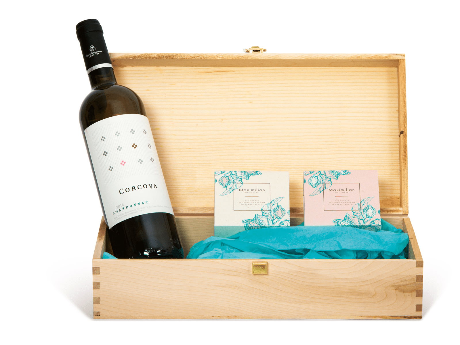 Vin alb și dublă bucurie la pachet. Oferă două cutii mici cu 4 trufe sau praline și un vin de Corcova, împachetate într-o cutie de lemn.
